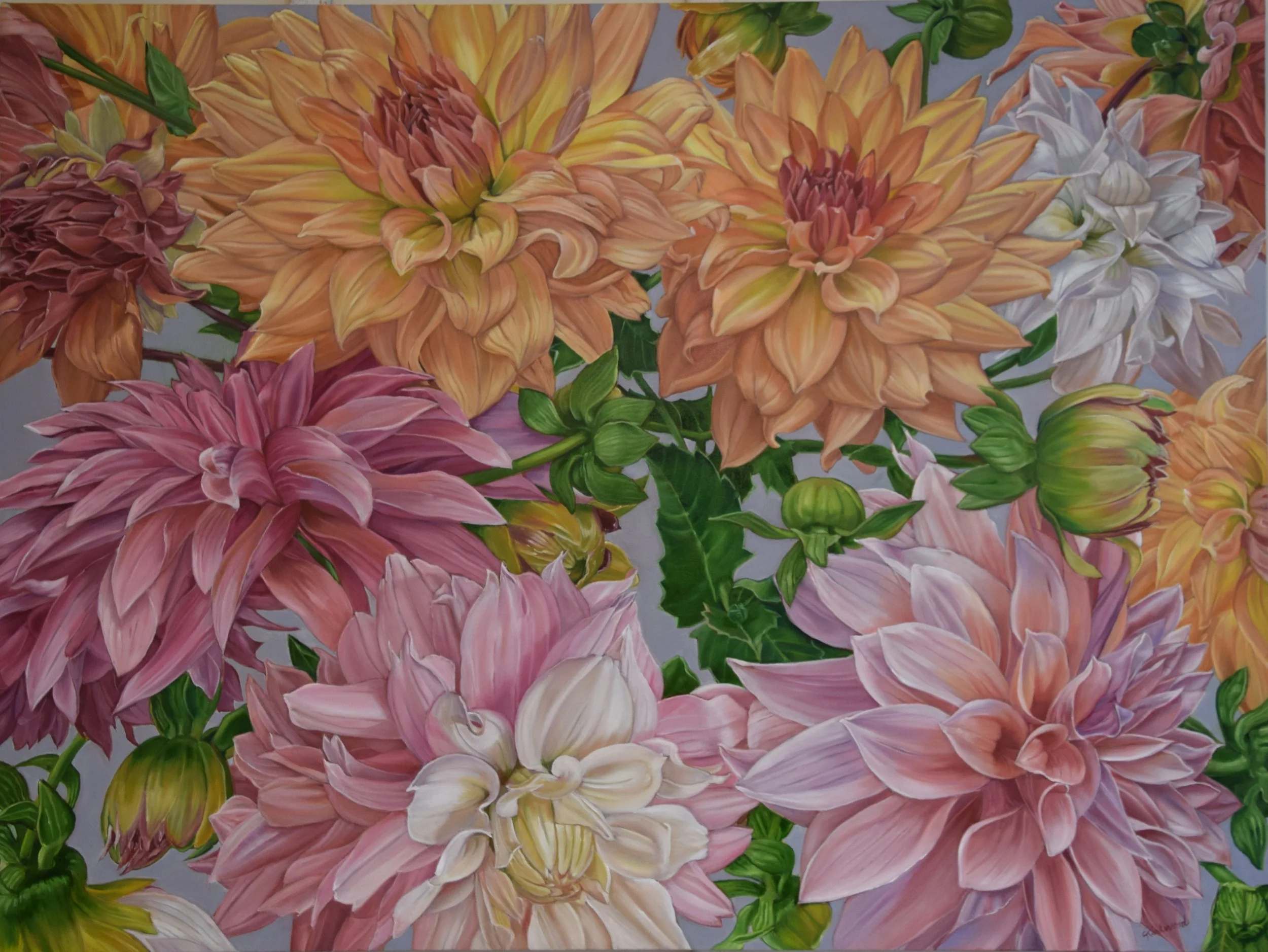 “Bedazzled by Dahlias”, oil on canvas, 36” x 48”
