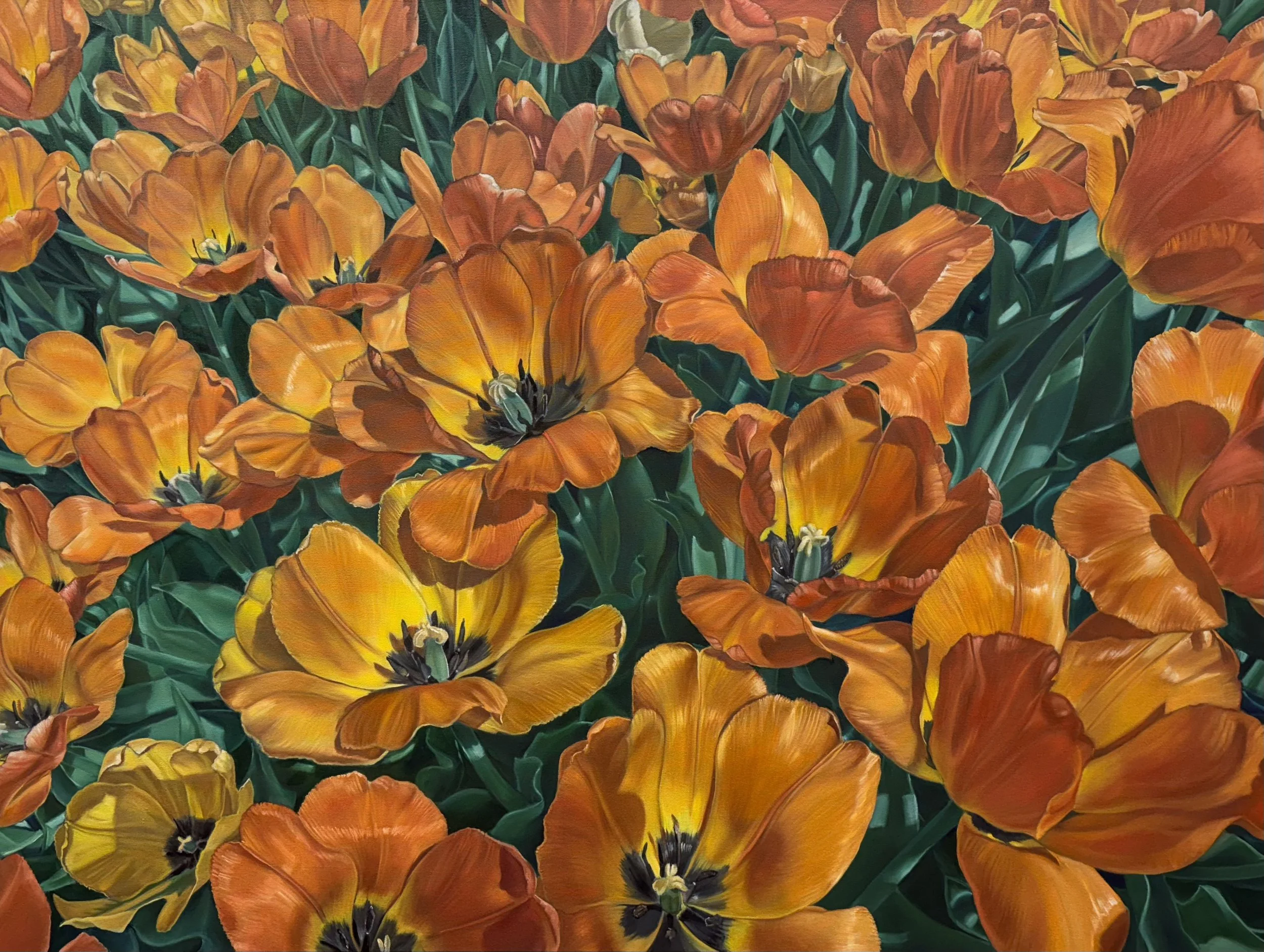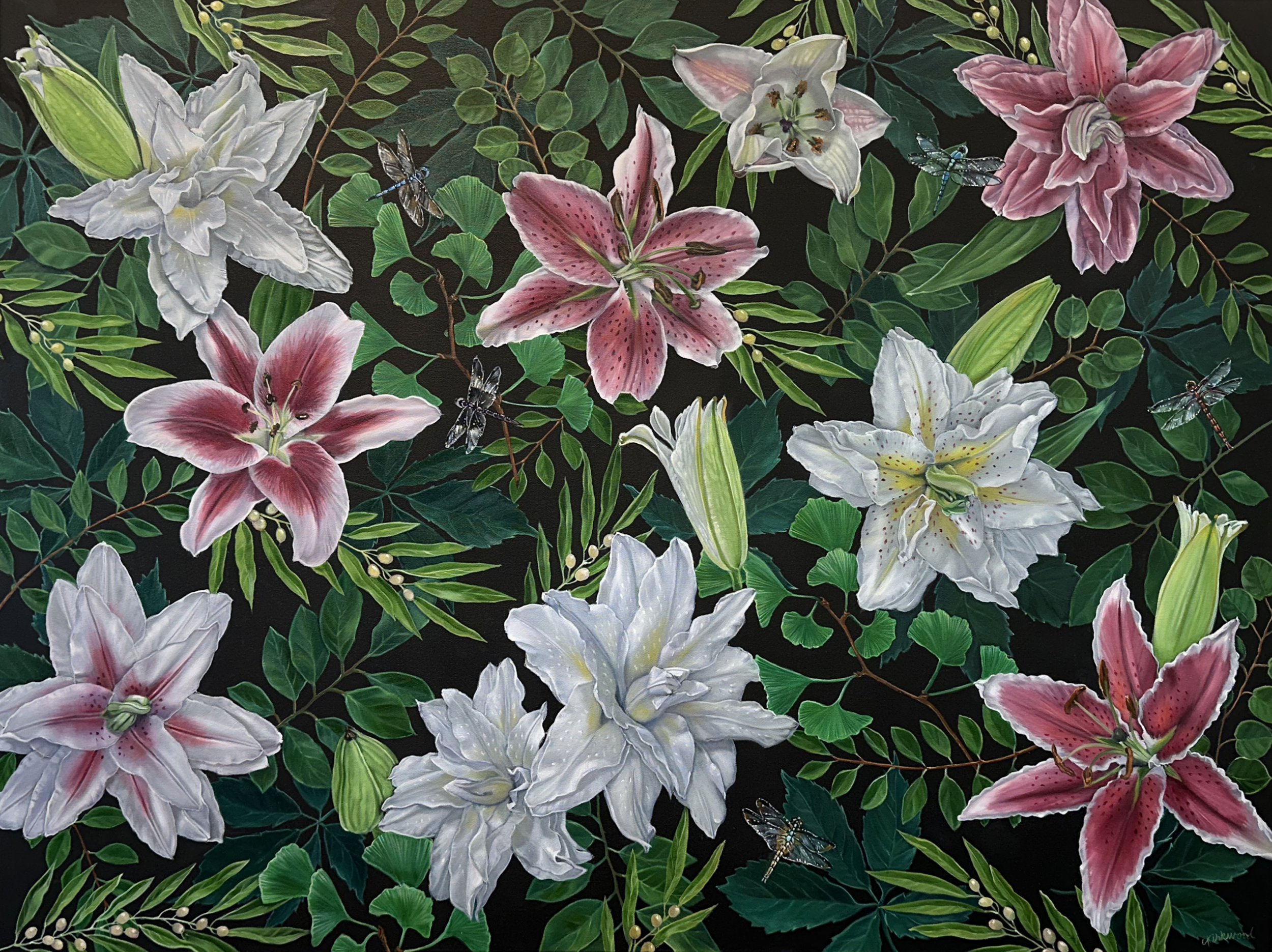 “Lillies Plus”, acrylic and oil on canvas, 36” × 48”