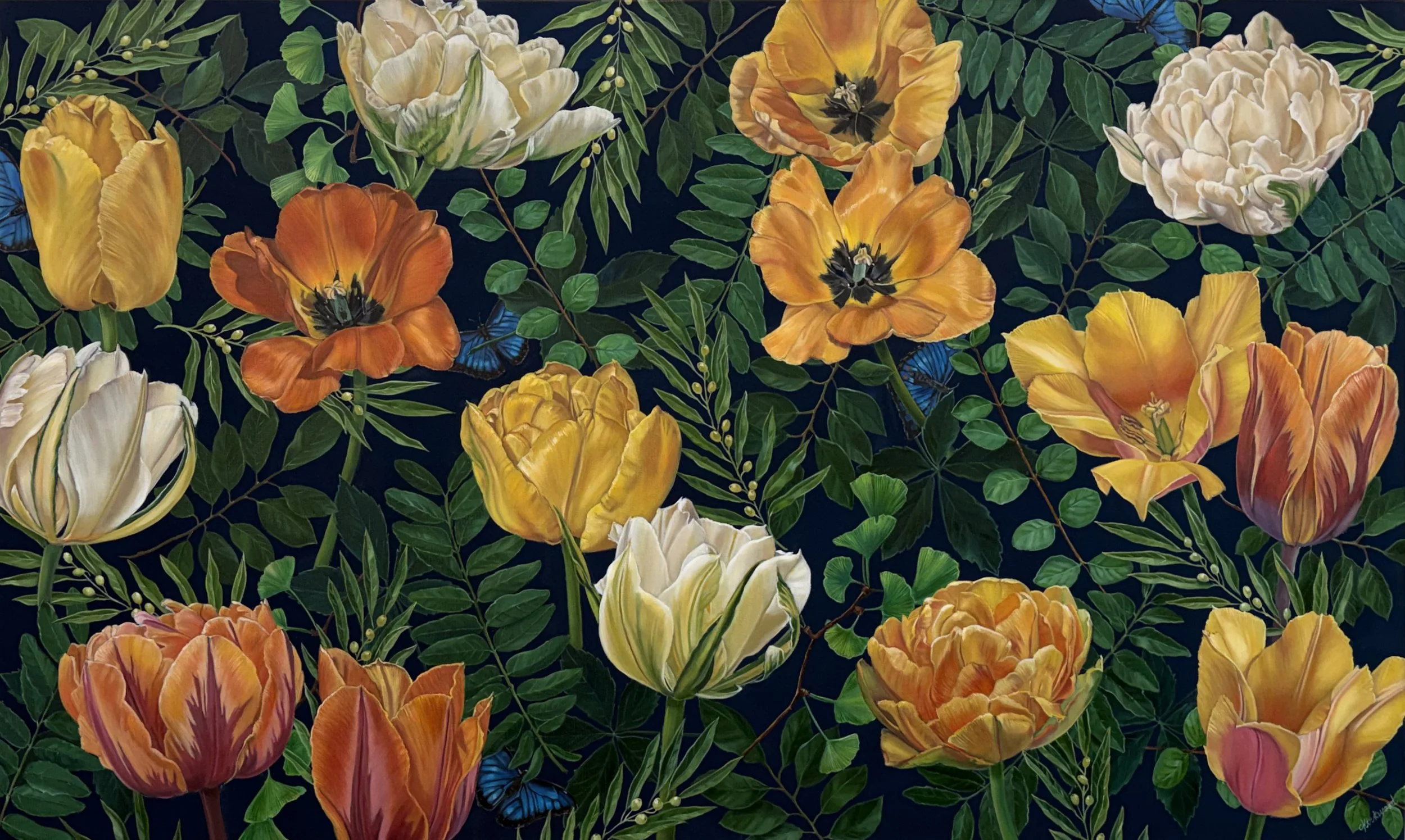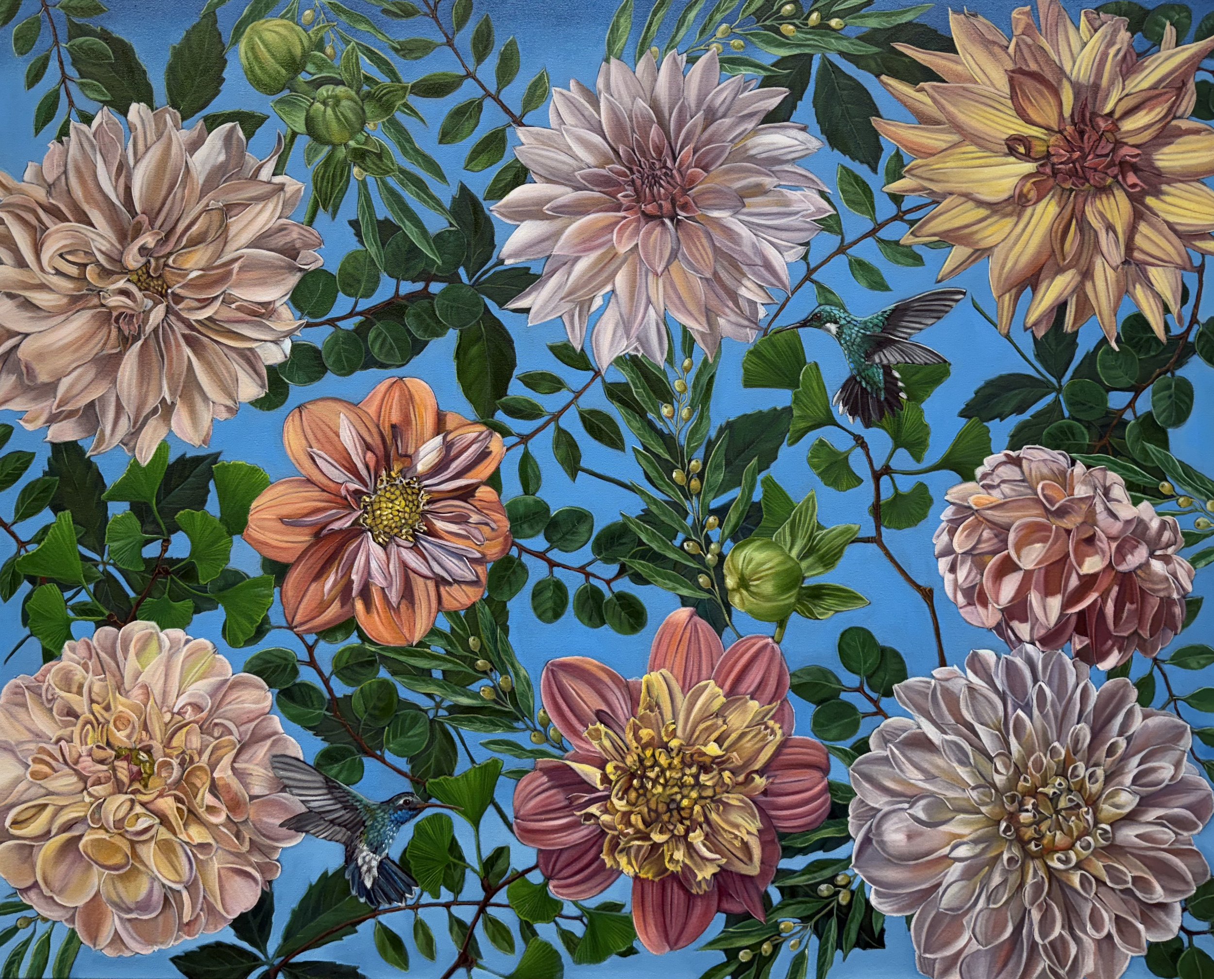 “Dahlias & Dragonflies”, acrylic and oil on canvas, 36” x 48”