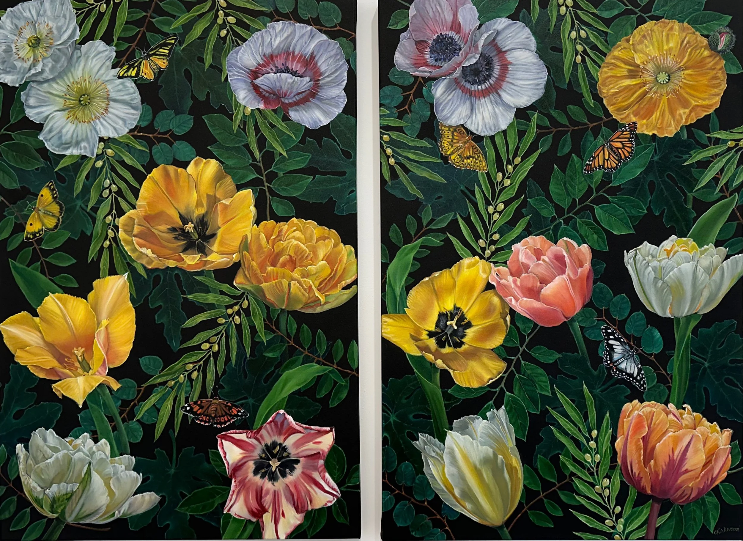 “Spring Garden”, acrylic and oil on canvas, each panel 24” x 36”